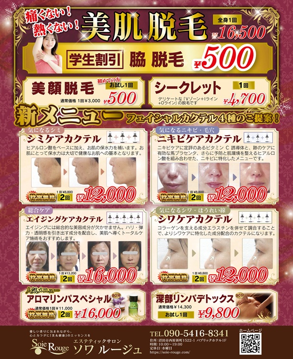 沼田市にあるエステサロン,脱毛,全身脱毛,ワキ脱毛,顔脱毛,エステサロンのソワルージュです。